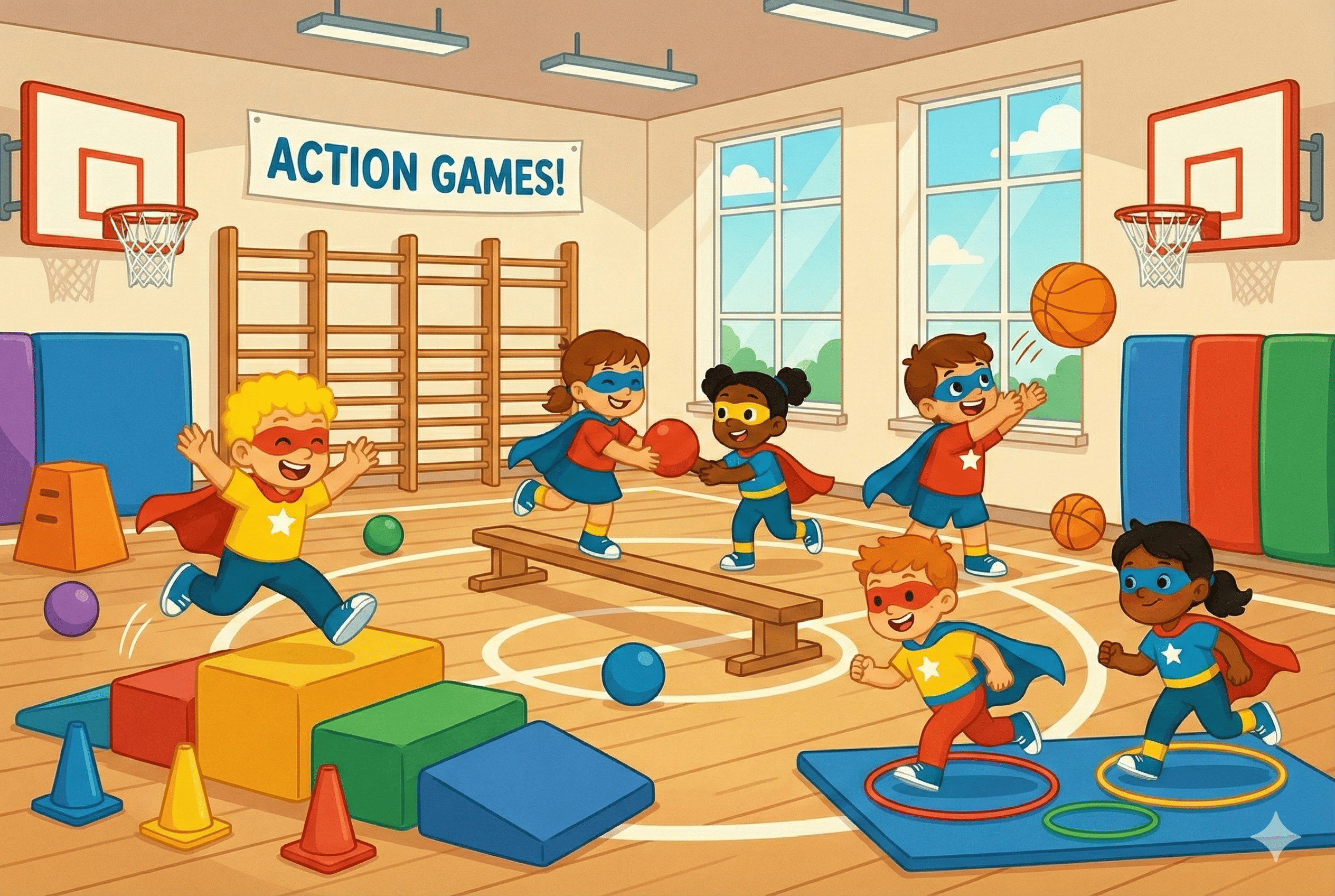 Im Helden-Action Games Kurs erleben Kinder zwischen 7 und 10 Jahren eine dynamische Mischung aus Bewegungsspielen, spannenden Herausforderungen und Team-Missionen. Dieser Kurs baut auf klassischen Bewegungs- und Ballsport-Elementen auf und erweitert sie um kooperative Challenges, abwechslungsreiche Spielsituationen und kreative Bewegungsaufgaben.
